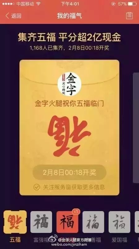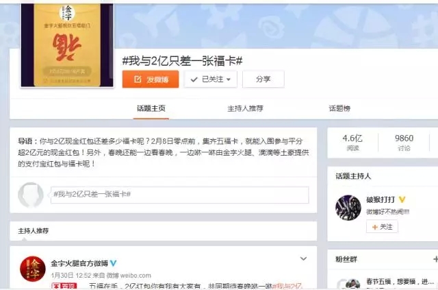 自前幾天支付寶將“集5福,搶2億+紅包”的活動(dòng)規(guī)則公布后,一時(shí)間,有關(guān)??〒Q贈(zèng)的話題強(qiáng)行霸屏。在有金字粉絲集齊了五福后,金字順勢(shì)在微博平臺(tái)上策劃的#我與2億只差一張???的微話題就引發(fā)了高達(dá)4.6億的閱讀量,網(wǎng)友們通過點(diǎn)贊評(píng)論及轉(zhuǎn)發(fā)分享的方式,第一時(shí)間表達(dá)了自己對(duì)于五福福卡和春晚2億紅包的高度期待!
